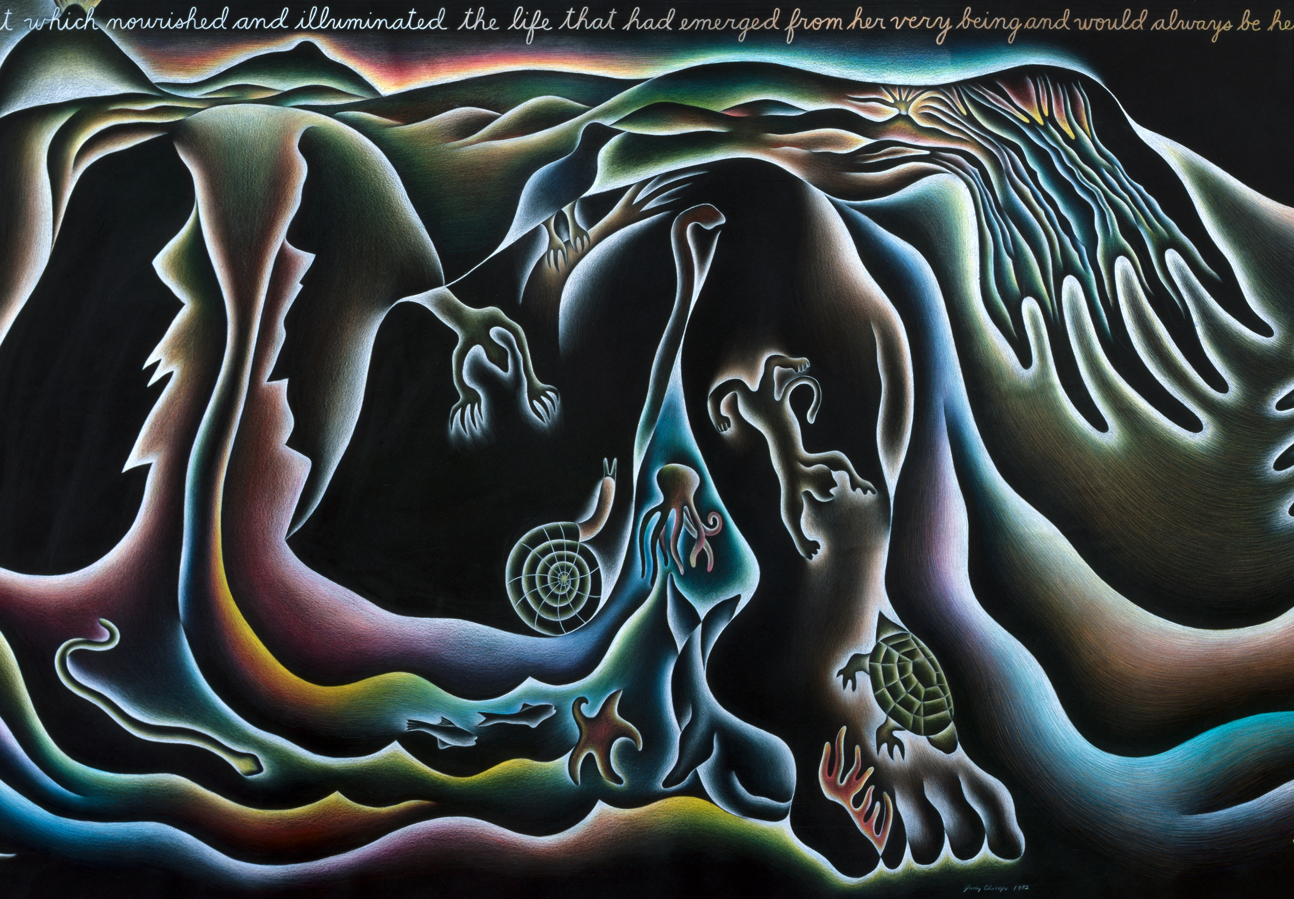 -Judy Chicago, In the Beginning (detail), uit het project Birth Project, 1982. Prismacolor op papier, 165,1 × 988,06 cm. © Judy Chicago / Artists Rights Society (ARS), New York. Foto © Donald Woodman / ARS, NY. Courtesy of the artist.
